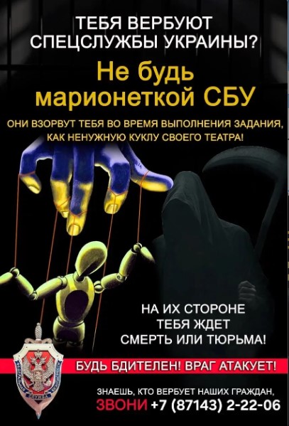 В связи с сложной международной обстановкой иностранные спецслужбы (включая украинские) могут пытаться вербовать граждан России для сбора информации или совершения противоправных действий. Помните: сотрудничество с ними – это государственная измена (статья 275 УК РФ), которая карается лишением свободы на длительный срок. Если к вам с подобным предложением обратились лично, по телефону или в интернете: 1. НЕ ВСТУПАЙТЕ в переговоры. 2. НЕ ВЫПОЛНЯЙТЕ никаких заданий. 3. НЕМЕДЛЕННО сообщите об этом в органы безопасности. Куда звонить: Отдел в Наурском районе УФСБ России по Чеченской Республике тел. +7 (87143) 2-22-06. Ваша бдительность – залог безопасности нашей страны и вашего спокойствия!